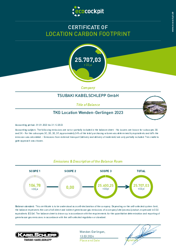 As of 1/1/2022, Kabelschlepp changed its electricity supply from gray electricity to 100 % green electricity, reducing a large emissions factor from over 1,000,000 kg CO2℮ to 0 kg CO2℮.