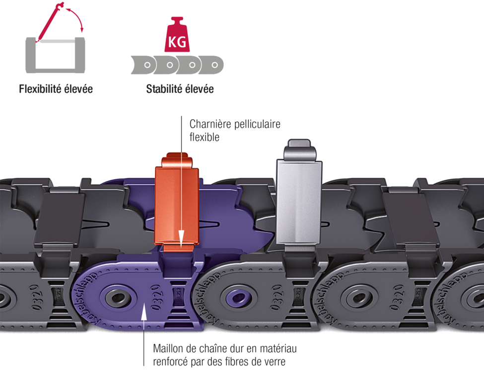 La technologie 2K (à 2 composants) de la QuickTrax® permet d’associer des caractéristiques a priori impossibles à associer : Stabilité et flexibilité. Les porte-câbles doivent être très stables et avoir une grande longueur autoportante. De plus, les câbles doivent pouvoir être posés rapidement. La QuickTrax® associe ces exigences grâce à une construction innovante et la combinaison de matériaux du corps de la chaine porte câbles est constitué de matériaux synthétique renforcé de fibres de verres et de lamelles en plastique spécial flexibles.