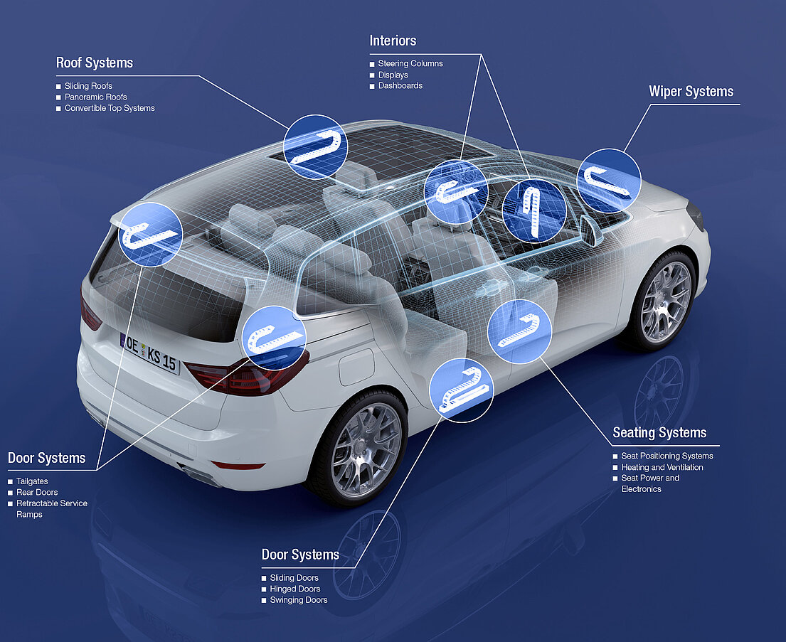 Increased vehicle comfort leads to more movable and power-controlled functions. Our products guide and protect the necessary sensitive and filigree cables. We have been equipping vehicle types from various brands with our energy chains since decades.