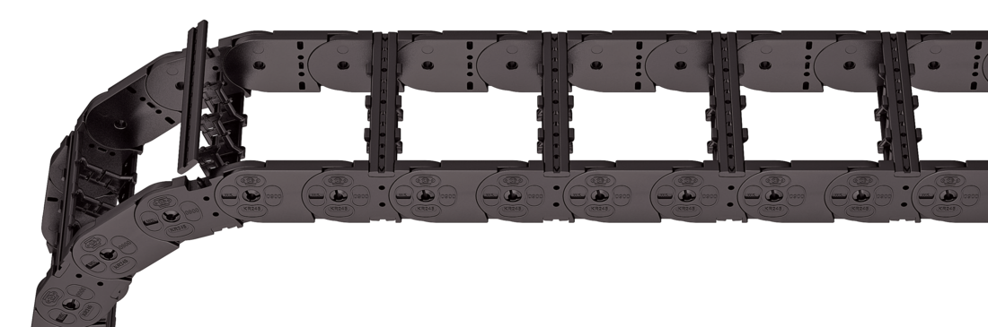 For applications with lateral accelerations and applications with the cable carrier rotated by 90°, the dividers can easily be fixed by turning the frame stay by 180°. The arresting cams click into place in the locking grids in the crossbar (version B). The groove in the frame stay faces outwards.
