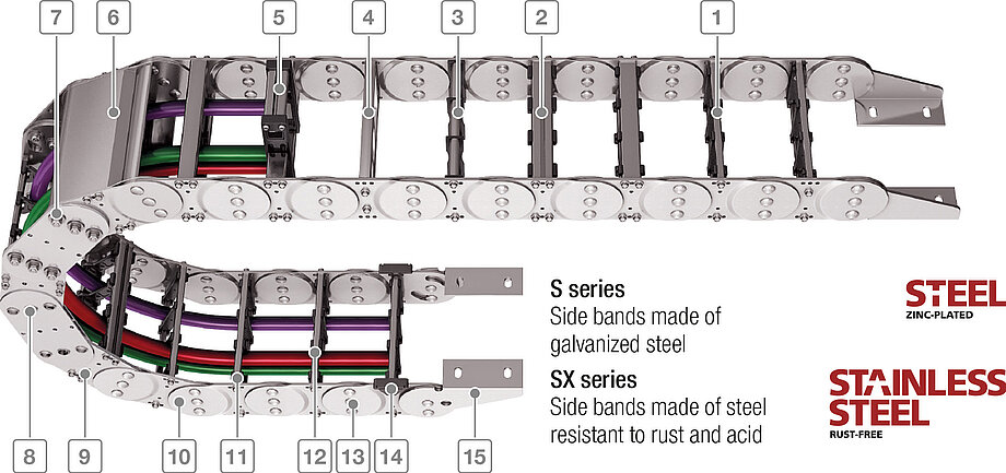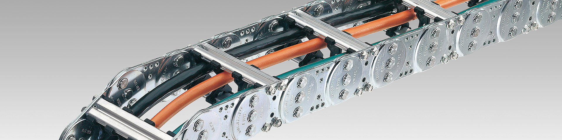 - Extremely robust, sturdy steel cable carriers for heavy mechanical loads and rough environmental conditions