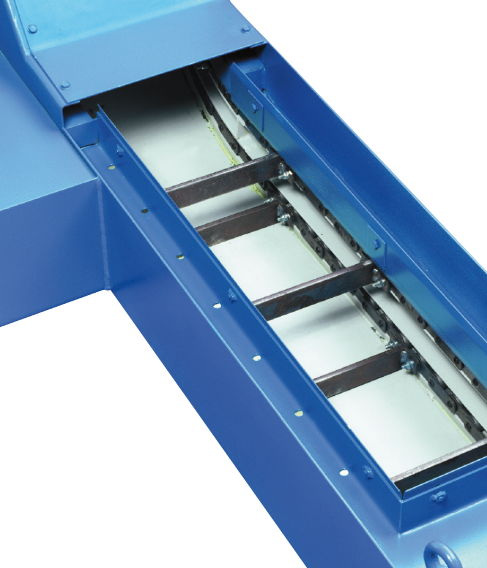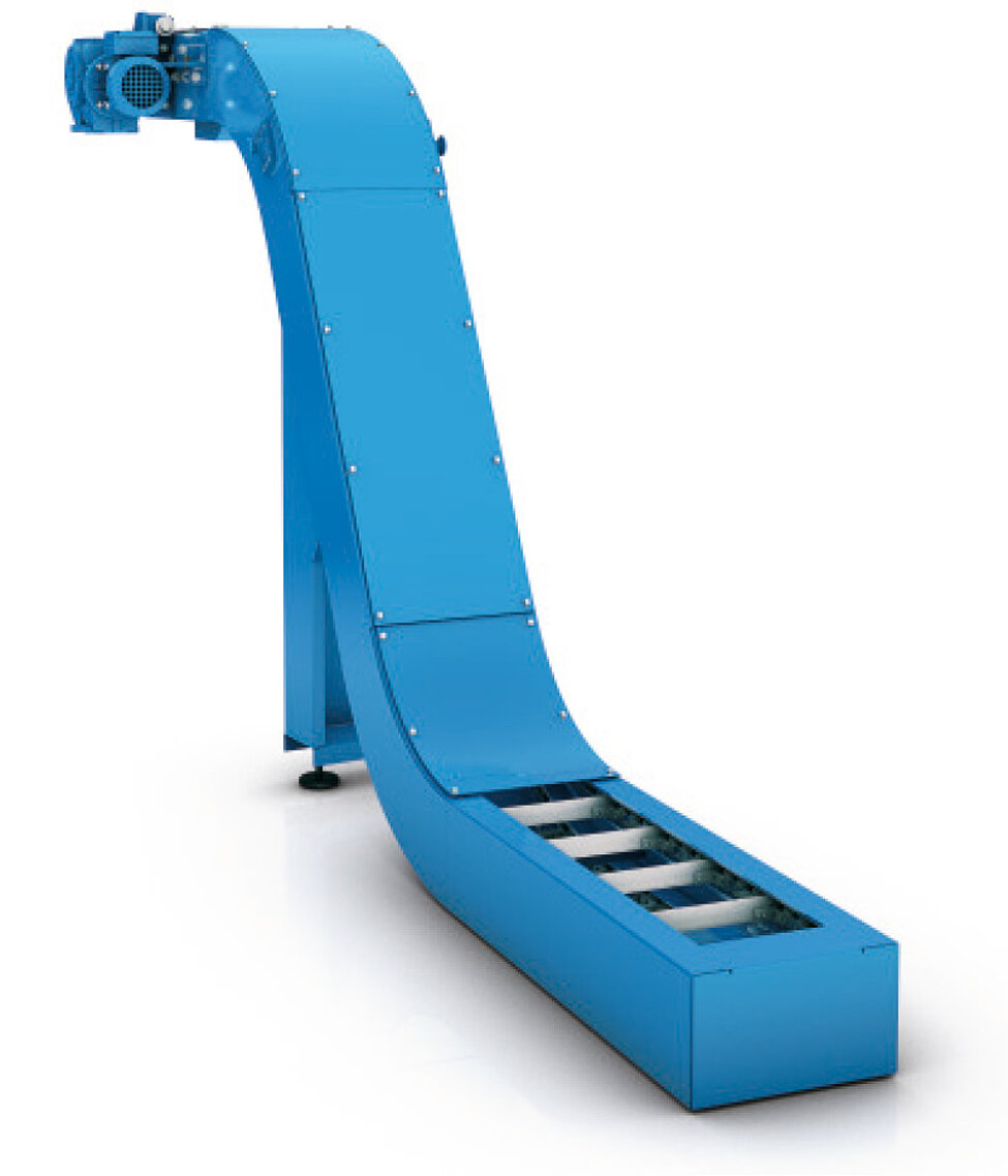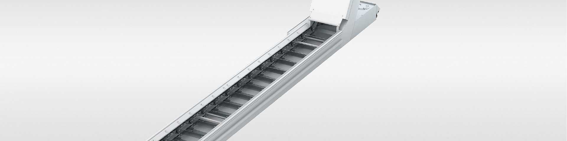 Transport of the material takes place via carriers which push the material along the floor of the housing towards the discharge. Cooling lubricants are collected in the conveyor housing and can be fed back into the machine circuit via an added-on container or a pumping unit. Our scraper belt conveyors can be used as stand-alone conveyors at machine tools or as linked conveyor systems. Depending on the design, the material to be conveyed is brought to the required height at a defined incline and then discharged.